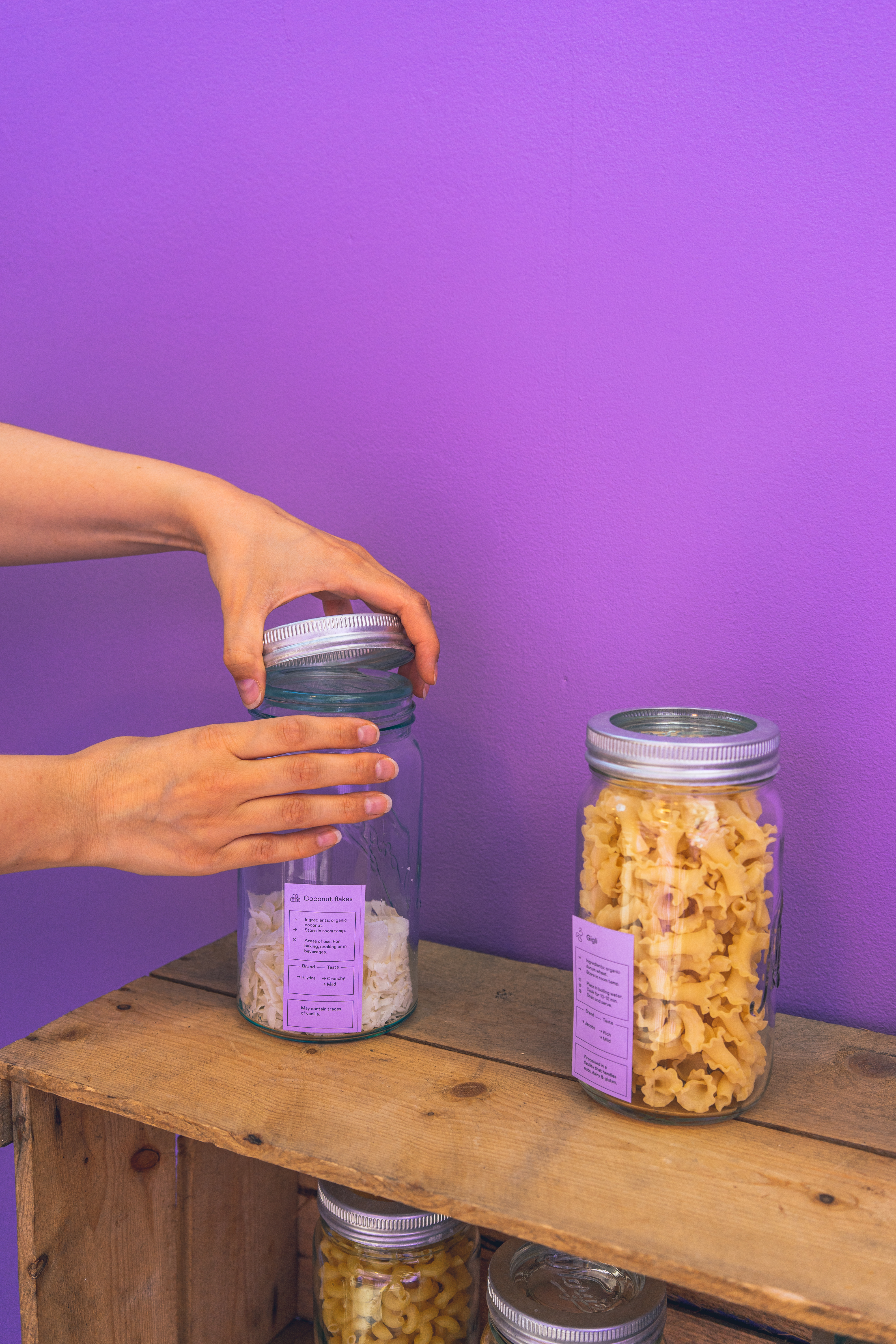 Expressive pins for personalizing the packaging, and informative labels that provide product information, are both tools that facilitate easier reuse of the packaging. The labels also serve as a vital communication platform for various producers and brands to leave their mark on their products. The stand beneath the dispensers and the metal holes in the packaging are designed with accessibility in mind, making it easier for elderly individuals or people with disabilities to handle.